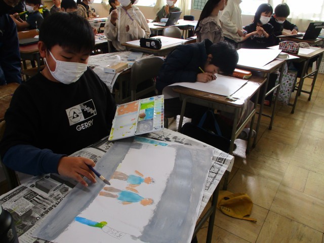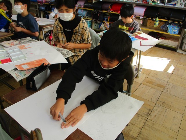 図工では、読書感想画に取り組んでいます。「注文の多い料理店」の朗読を聞いて、イメージをふくらませて自分の想いも入れながら描いています。