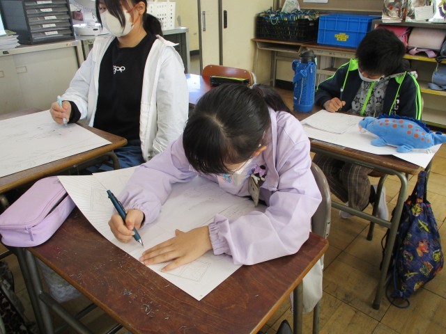 今日から新しい作品作りをします。「ミラクルミラーワールド」という鏡に映る形を想像しながら、思い思いの世界を作ります。今日は、作成のための下描きをしました。何を作ろうかのワクワクの笑顔が見られました。