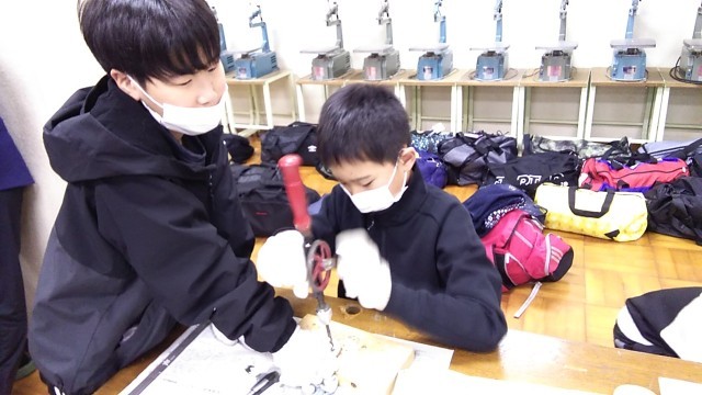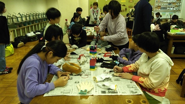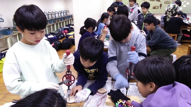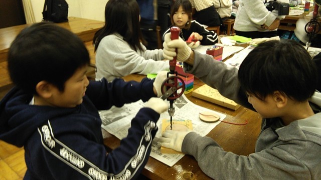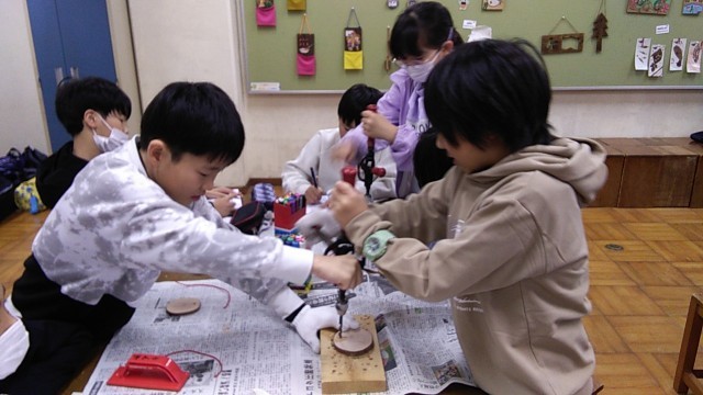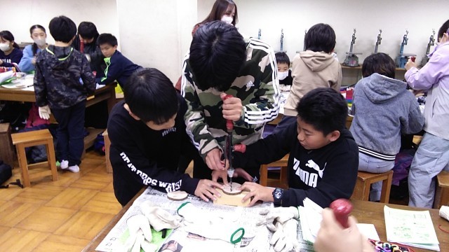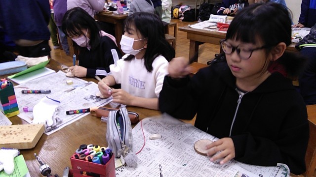 野外教育活動の最後に、みんなと力を合わせてクラフト活動をしました。記念メダルを作成しました。