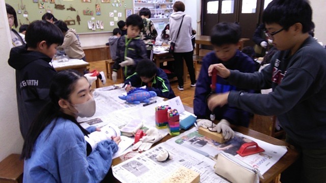 図工の時間で作成していた「ミラクルミラーワールド」がほぼ完成しました。鏡面を工夫しながら、自分が表したい場面を紙粘土で表しました。