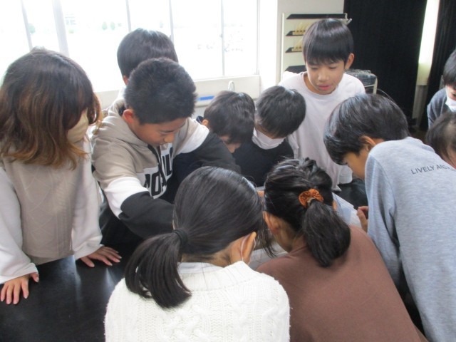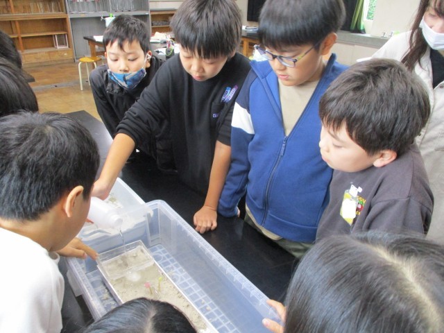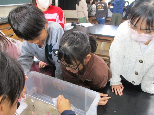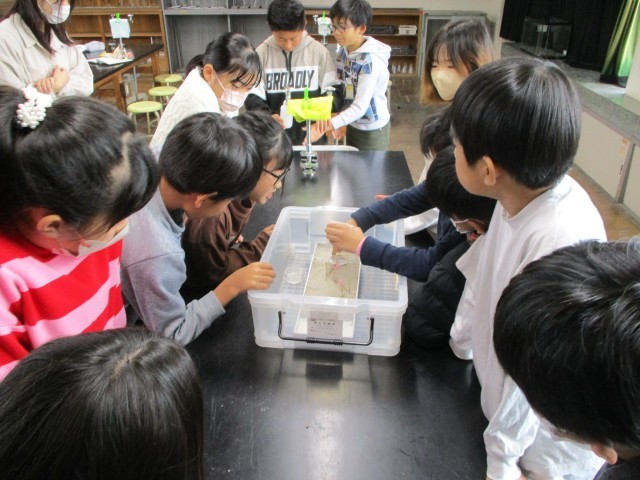 理科では、流れる水のはたらきについて学習しています。水の量が増えると浸食・堆積の様子がどうなるか予想しながら実験キットでみんなで確かめました。