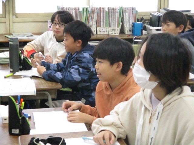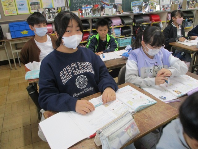 算数では、「平均」の学習をしています。振り返りでは、「比例の学習おもしろい」と言っている児童もおり、意欲的に取り組んでいます。