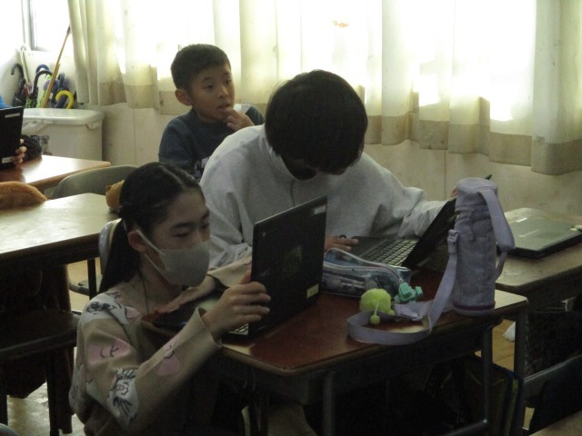 「わくわくフェスタ」に向けて、調べたことをスライドにまとめています。工業や水産業、農業などそれぞれのチームに分かれてスライドづくりをすすめています。
