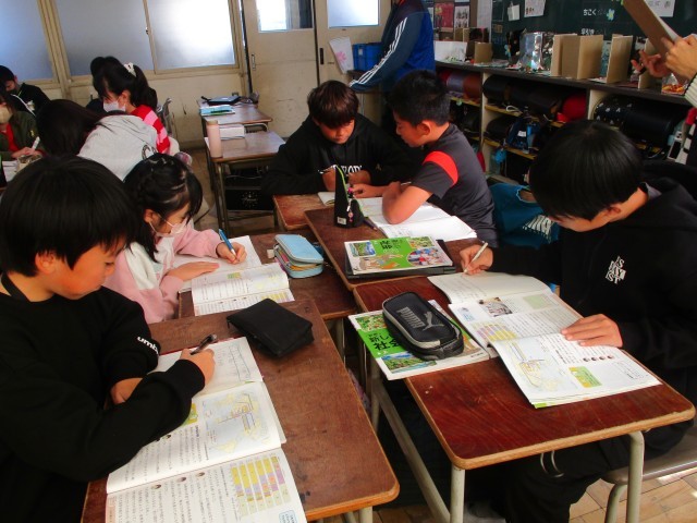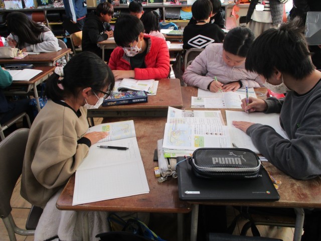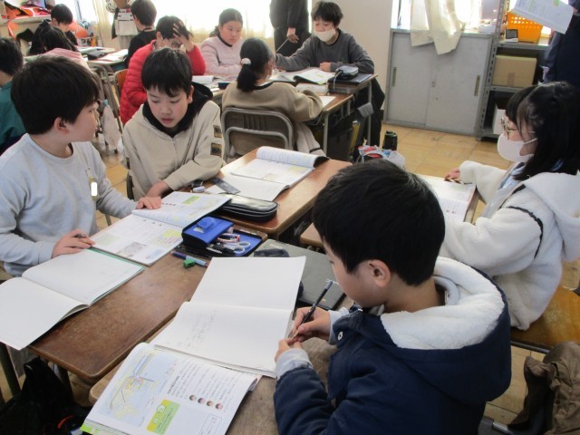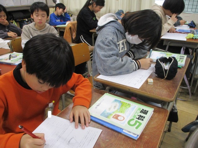 算数では、「平均」の学習をしています。振り返りでは、「比例の学習おもしろい」と言っている児童もおり、意欲的に取り組んでいます。