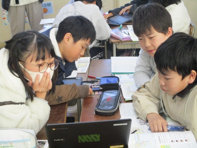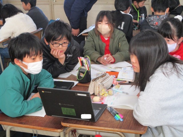 社会科では、日本の輸出について学習しています。今日は、グループで分担して、図やグラフや本文から日本の輸出の特徴について読み取り、情報を共有し合いました。