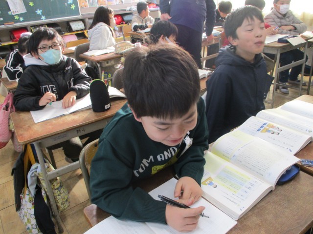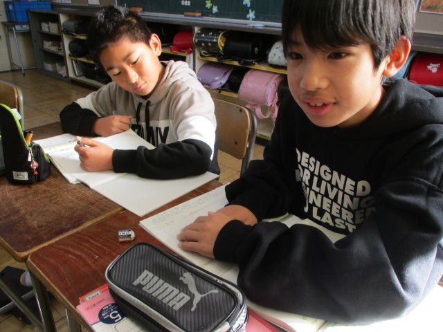 算数では、「平均」の学習をしています。振り返りでは、「比例の学習おもしろい」と言っている児童もおり、意欲的に取り組んでいます。
