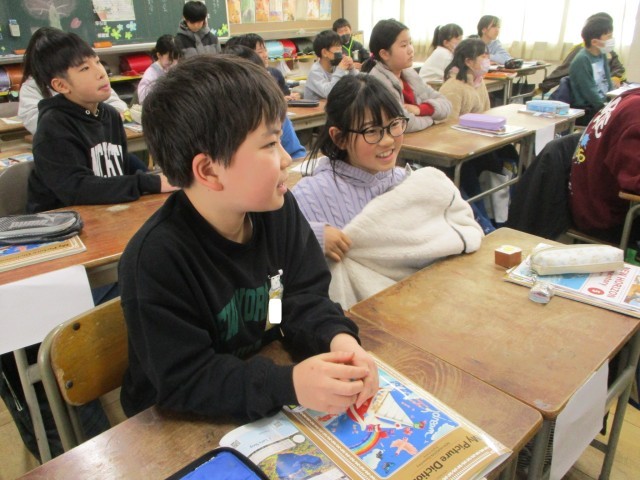 外国語では、行きたい場所を尋ねたり、答えたりする練習をしました。授業の最後には、消えた単語は何かを推測するゲームで楽しみました。