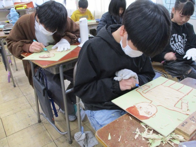 図工の時間には、木版画を行っています。下描きに沿って慎重に彫り進めました。