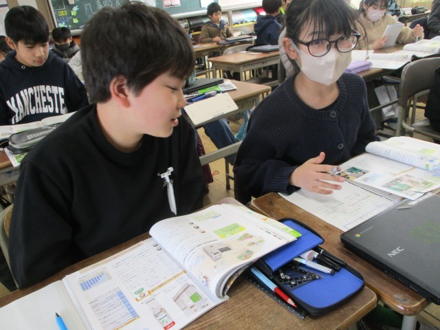 社会科では、日本の輸出について学習しています。今日は、グループで分担して、図やグラフや本文から日本の輸出の特徴について読み取り、情報を共有し合いました。
