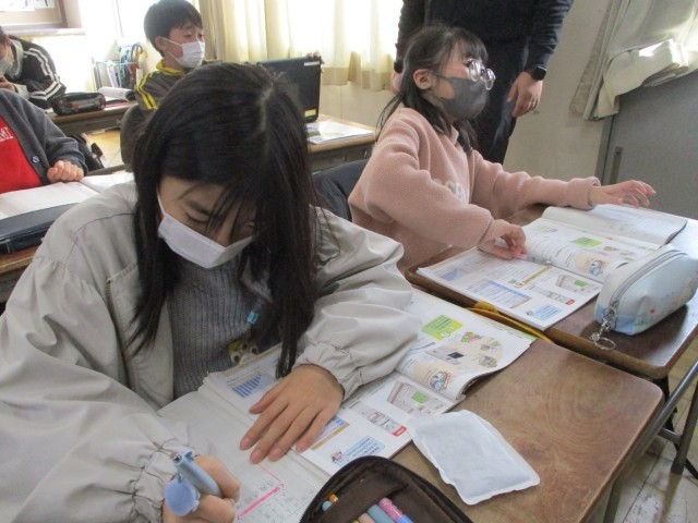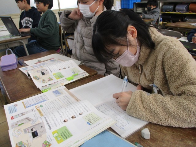 外国語では、行きたい場所を尋ねたり、答えたりする練習をしました。授業の最後には、消えた単語は何かを推測するゲームで楽しみました。