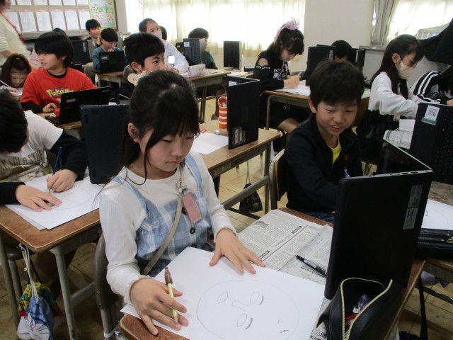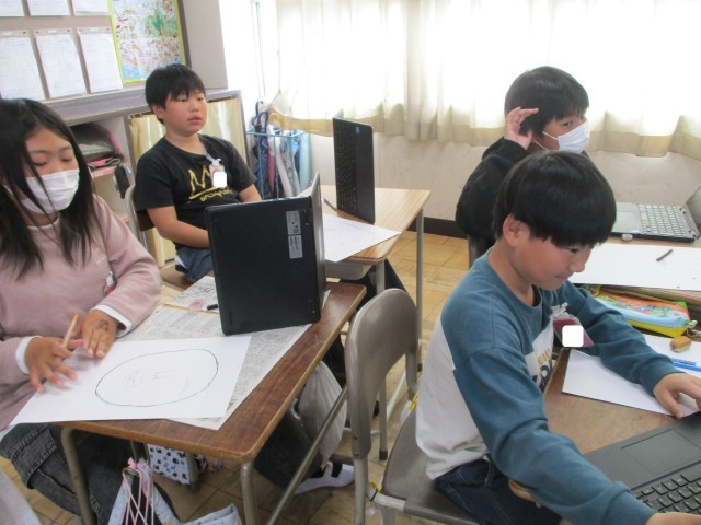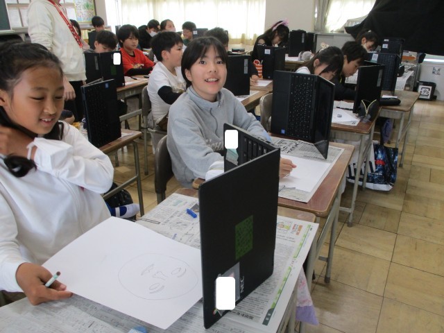 図工では、木版画に取り組みます。今日は、学習者用端末も活用しながら、下絵の完成を目指してがんばりました。