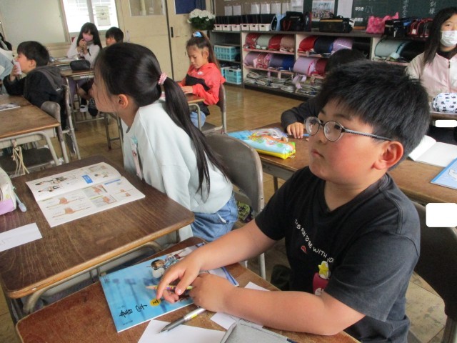 外国語では、行きたい場所を尋ねたり、答えたりする練習をしました。授業の最後には、消えた単語は何かを推測するゲームで楽しみました。