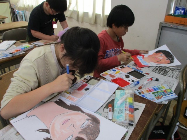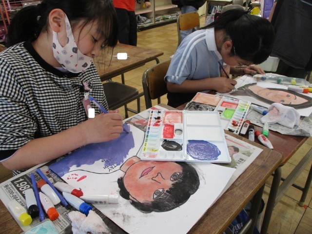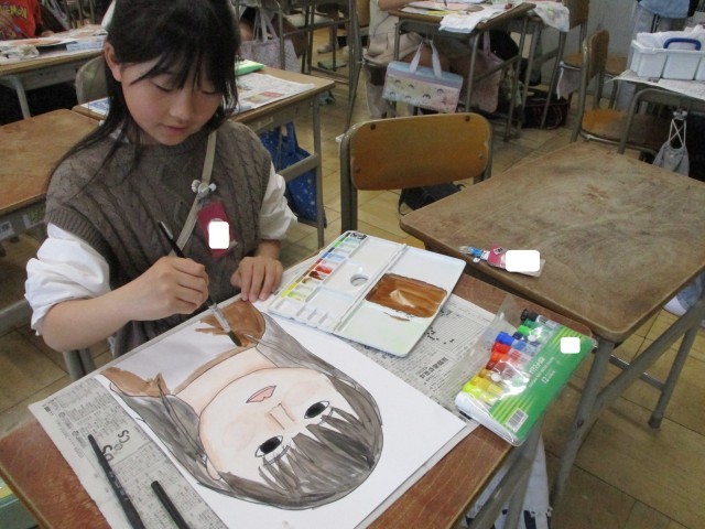 水彩絵の具で自画像を描きました。色の重なりや混色を工夫して塗り、自分の顔の特徴をよく捉えながら、最後まで丁寧に仕上げることができました。 -