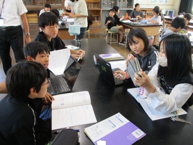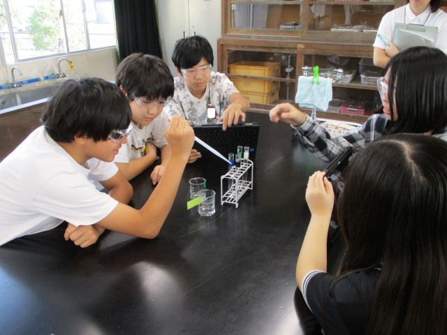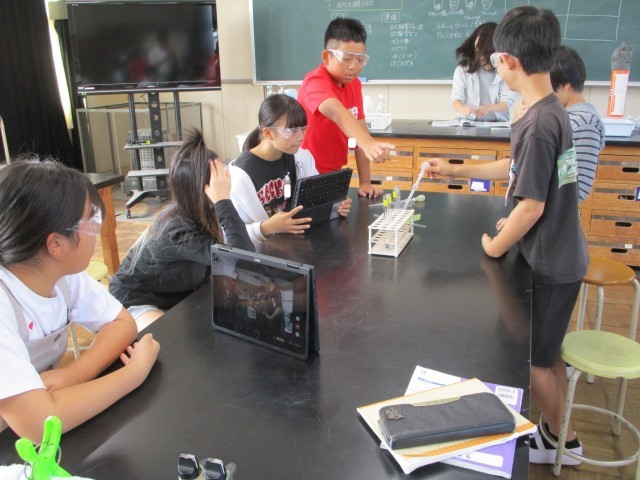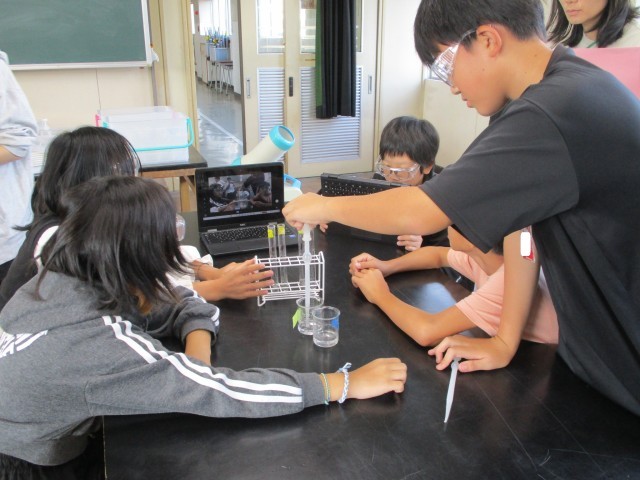 理科では、グループのメンバと協力しながら、金属に塩酸を加えたときの反応を調べました。