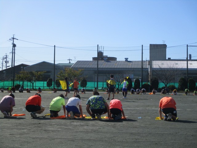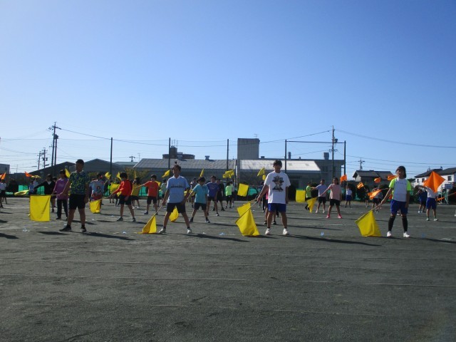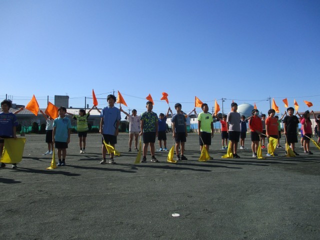 フラッグを使っての練習が始まりました。まだまだ振り付けを覚える段階ですが、バサッという音がそろうと、とてもかっこよかったです。旗の振り方や隊形移動、顔の向きなど覚えることがたくさんありましたが、真剣に練習に取り組むことができました。