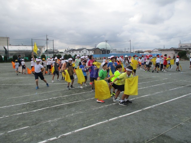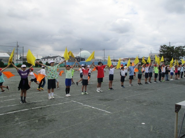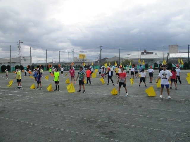 フラッグを使っての練習が始まりました。まだまだ振り付けを覚える段階ですが、バサッという音がそろうと、とてもかっこよかったです。旗の振り方や隊形移動、顔の向きなど覚えることがたくさんありましたが、真剣に練習に取り組むことができました。