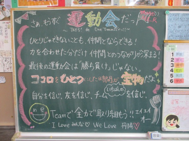 教室の黒板には、担任から運動会に対してのメッセージが書かれています。子どもたちは、その想いを受け取りながら、今日も練習に取り組みました。