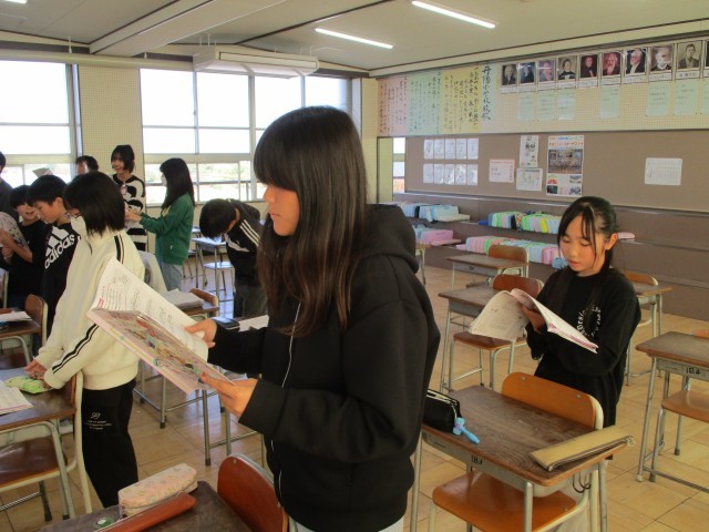 しおりの内容がしっかり頭にはいっているか確認するため、修学旅行検定を行いました。テスト前には友だちと問題を出し合ったり、大切なところに線を引いたりして勉強していました。