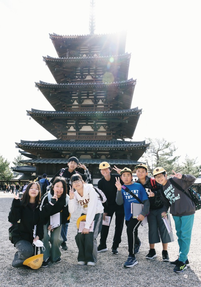 法隆寺を見学しています。ガイドさんの話をしっかりとメモをしながら世界文化遺産を肌で感じました。