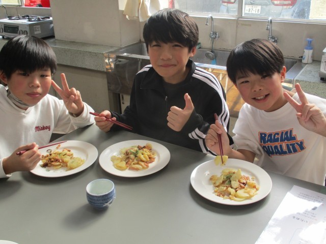 家庭科の調理実習では、みんなと力を合わせて、「ベーコンポテト」をつくりました。