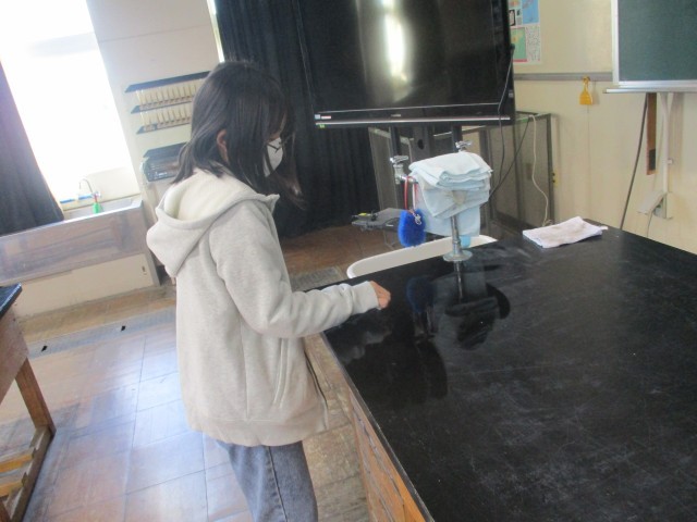 理科では、「てこ」の学習をしています。実験をして力点の位置が変わると手ごたえがどのように変わるのかを実験で調べました。