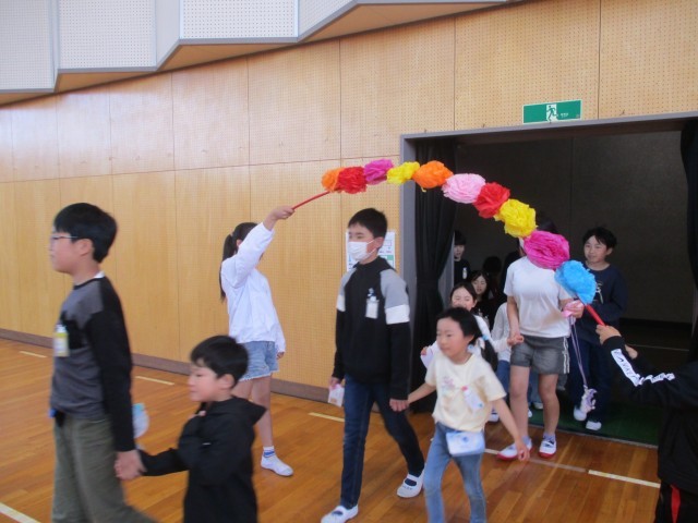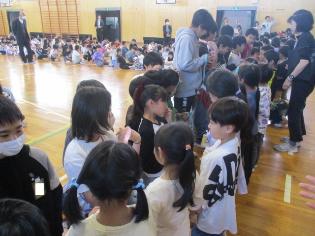 本日、全校児童で「1年生を迎える会」を開催しました。 体育館に響く手拍子の中、6年生は1年生と手をつないで入場。手作りのメダルを首にかけてあげた後、一緒に学校紹介クイズに挑戦しました。 この会をきっかけに学年の枠を超えた絆がさらに深まることを願っています。6年生には最高学年としての自覚と責任を持ち、これからの学校生活をリードしてほしいと思います。