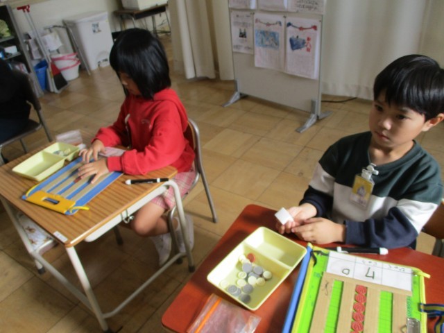 模擬のお金を使って、お金の学習をしたり、新出漢字の練習をしたり、ドングリなどの秋の自然のものを使った工作をしたりしました。