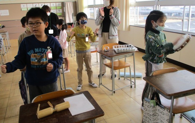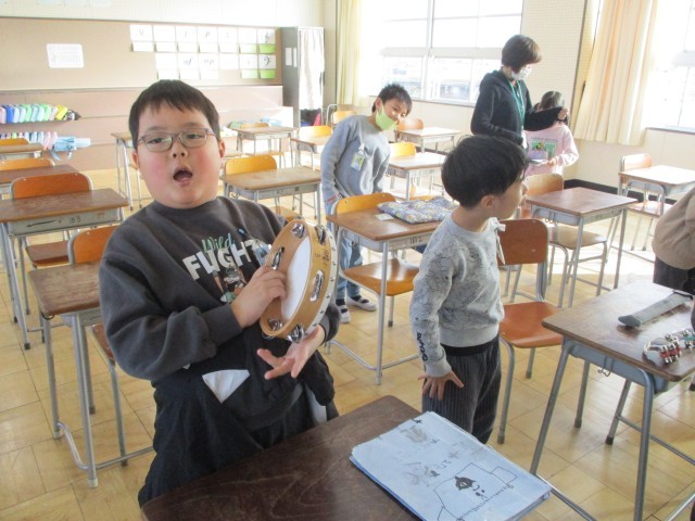 音楽の時間には、鍵盤ハーモニカやリコーダー、ウッドブロックの担当に分かれて、みんなで「ミッキーマウスマーチ」を楽器で演奏しました。
