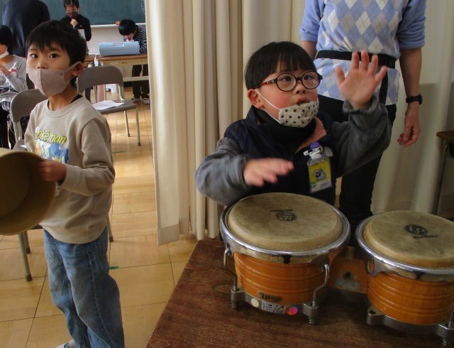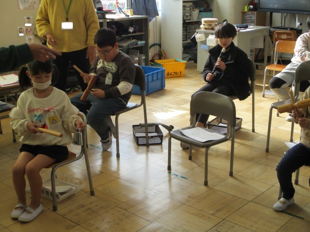 音楽の時間には、鍵盤ハーモニカやリコーダー、ウッドブロックの担当に分かれて、みんなで「ミッキーマウスマーチ」を楽器で演奏しました。
