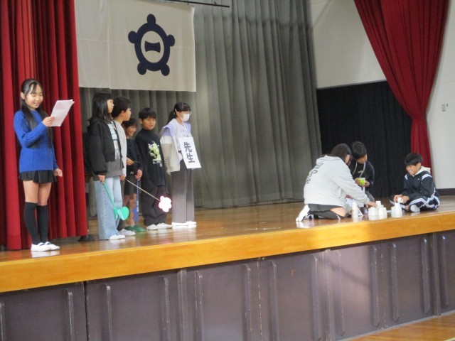 人権集会がありました。児童会役員・代表委員の児童が、劇を通して、相手に「ふわふわ言葉」を使うことの大切さを伝えました。