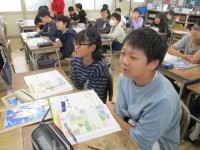 町の施設への行き方を英語で案内する練習をしました。「Go straight for one block. Turn left. Go straight for one block. You can s...
