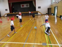 サッカーボールを使って、足でボールをコントロールしたり、的をねらってけったりしました。難しく感じた子もあきらめずにがんばりました。「がんばれー」という応援の声も聞こえました。