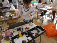 図工では、持ってきた空き箱を組み合わせて動物を作りました。「何の動物作っているの?」「ペンギン!!」「クマ!」「ウサギ!」「ネコ!」笑顔で答えてくれました。