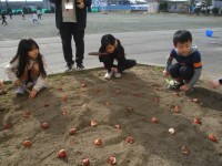 学年の花壇に「チューリップ」の球根を、みんなで植えました。子どもたちは、「元気に咲いてね!」と声をかけていました。