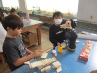 図工では、木工作に取り組んでいます。釘を打ったり、のこぎりで木を切ったりしながら、イメージしたものに近づけるように楽しく取り組んでいます。