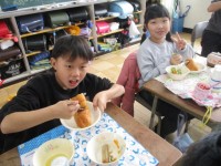 今日の給食には、揚げパンが出ました。あまり出ない特別メニューのため、子どもたちは大喜び!おいしくみんなでいただきました。