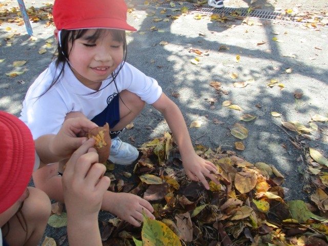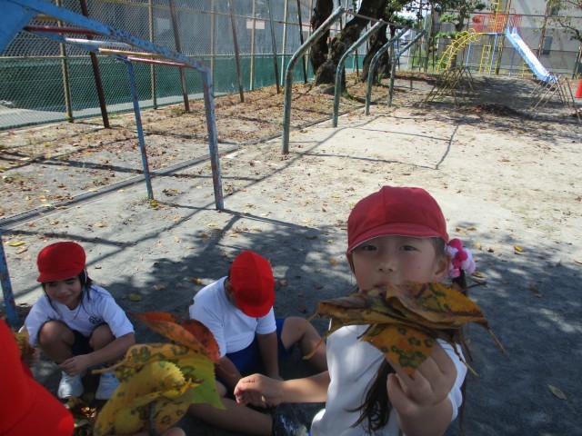 「うわぁ!きれい!」と歓声をあげて早速葉っぱを拾ってみると、黄色に緑の○○がいっぱい!「チーターの模様!」「すごい!」いつのまにか他の友だちも集まってきて、葉っぱでトルネードポテトを作ってごっこ遊びが始まりました。今度みんなで秋見つけをしようね。