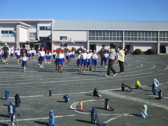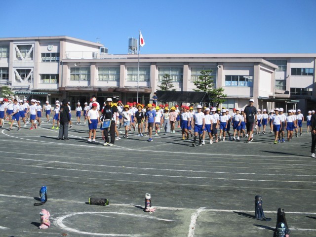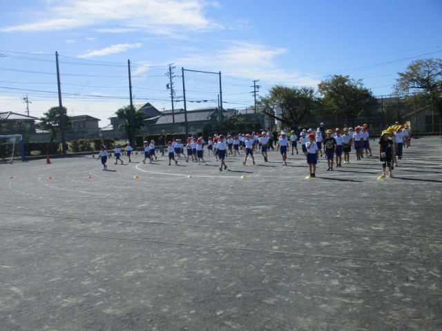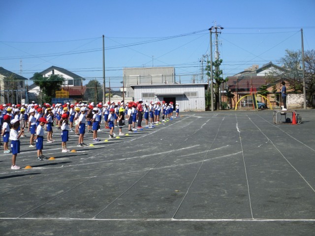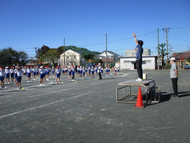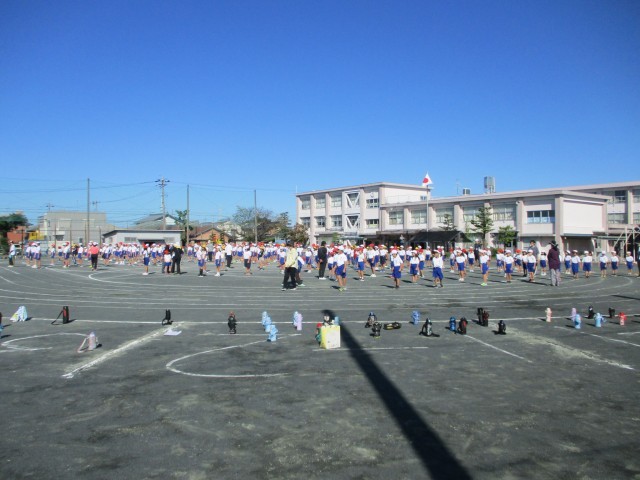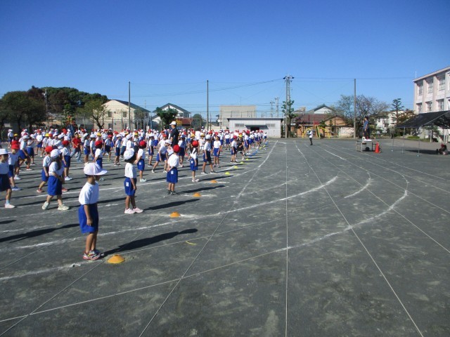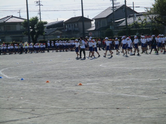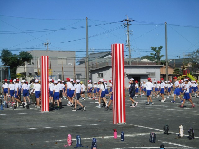 1時間目に、運動会の開会式で行う、入場と退場の練習を行いました。入場の練習では、応援席から担任の先生の誘導のもと、所定の位置まで移動しました。6年1組の男子児童は全体の整列の基準となるように、今日は右手を上げてきれいに整列していました。他の児童は、それにならって横の位置を揃えていました。退場の練習では、「回れ右」の練習をしたり、担任の先生の誘導のもと整列して応援席に戻ったりしました。どの児童も落ち着いて手順を確認しながら、取り組んでいました。