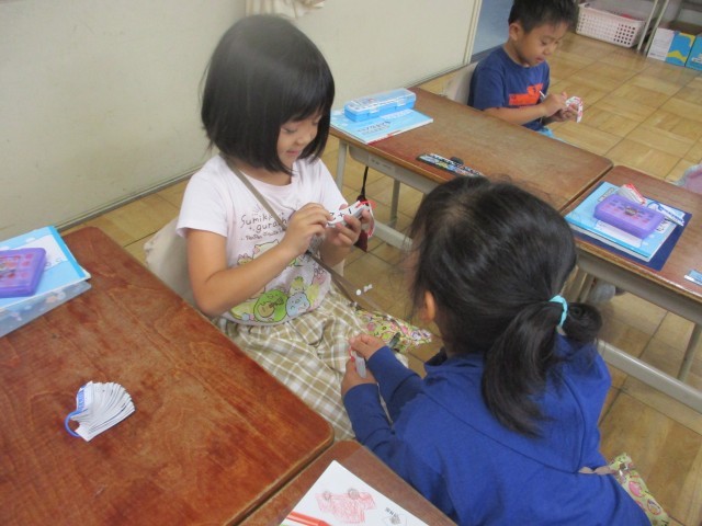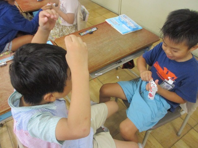 いつも算数の学習の前には復習や計算カードを行っています。ペアのお友だちと聞き合って「まる!」や「はなまる!」とにっこにこ。お友だちに褒めてもらうと嬉しいね。