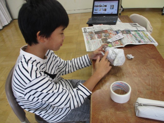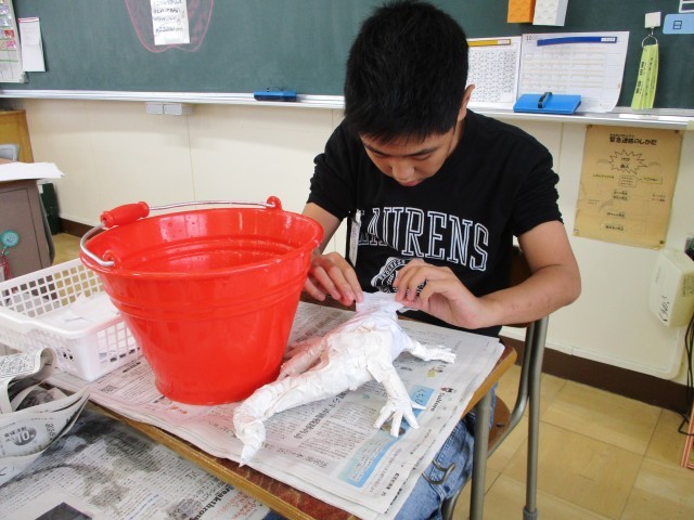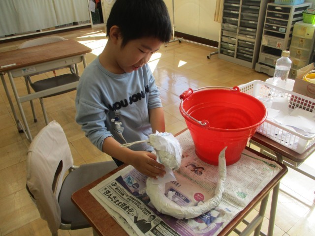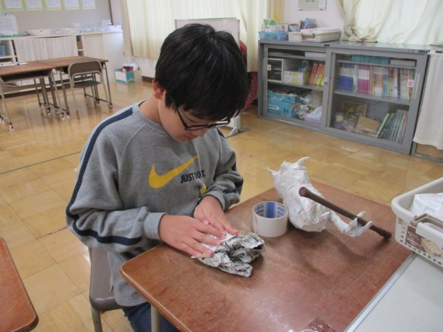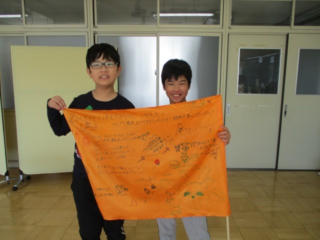 5年生のみなさんが、6年生へのメッセージを書いたフラッグを届けてくれました。心のこもったメッセージに感動しました。教育展に向けて、作品作りも進んでいます。