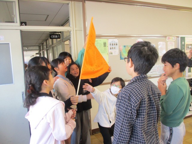 今週、6年生に「運動会ありがとう」と「修学旅行いってらっしゃい」の気持ちをこめて、フラッグにメッセージを書いて贈りました。そして今朝、5年生のみなさんが画用紙に書いてくれた一文字メッセージを、修学旅行の出発式で飾りました。6年生のみなさんは、笑顔で修学旅行に旅立ちました。