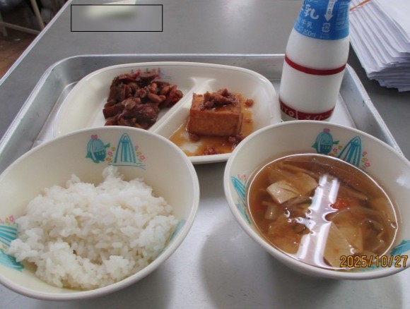 今日のおかずは、「ゆばのすまし汁」「絹厚揚げのそぼろあんかけ」「鉄火みそ」(大豆のみそ和え)。