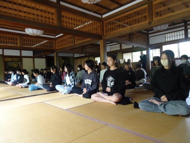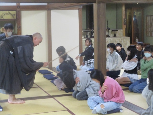静寂の中、座禅体験をしました。警策を受け、心が引き締まりました。