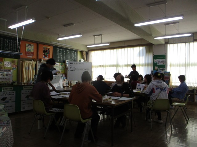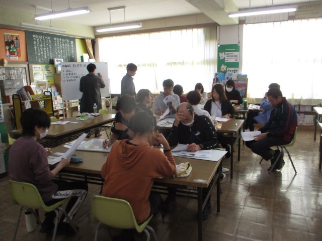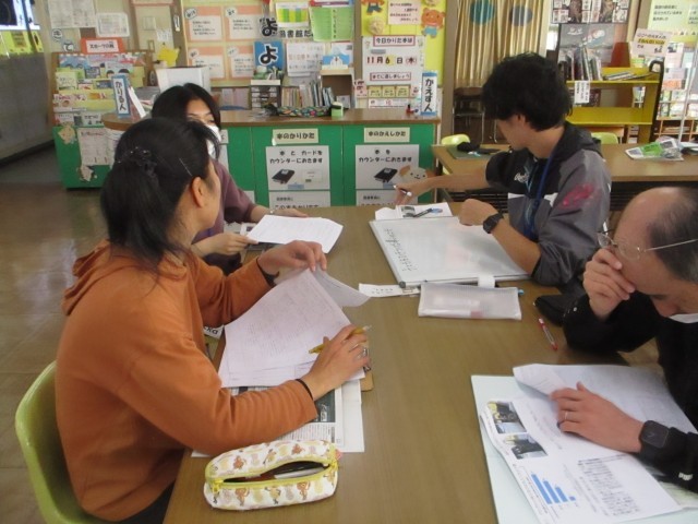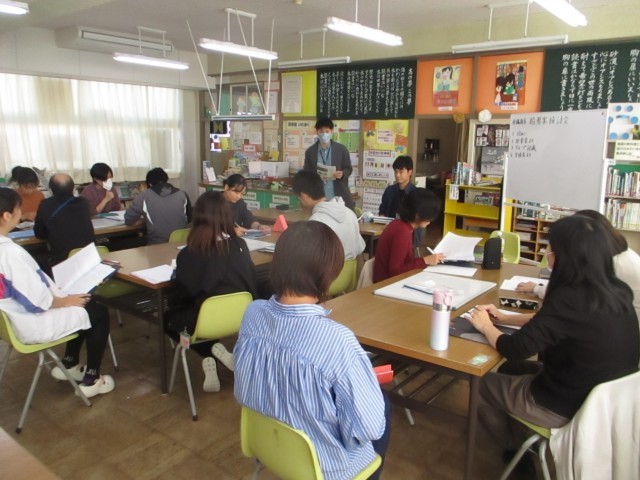 授業後は、現職教育全体会(教職員の研修会)を図書館で行いました。
