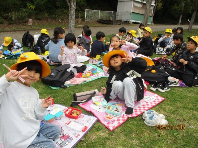 お昼は外の芝生広場で美味しいお弁当をいただきにっこにこ。おやつの後も外の遊具で遊んだり、どんぐりを拾ったりしました。
