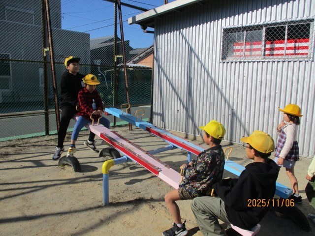6年生のみなさんが、一緒に遊べる遊びを考えてくれたので、鬼ごっこやだるまさんがころんだ、鉄棒や竹馬、シーソーやなわとびなど、みんなとても楽しそうに遊んでいました。