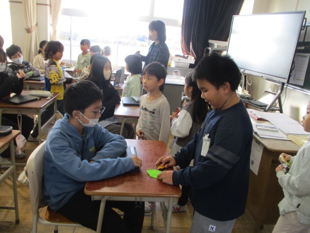 昨日一緒に遊んでくれた6年生のお兄さん・お姉さんに折り紙で作ったプレゼントを渡しにいきました。ちょっとドキドキしながら「ありがとうございました。」「また、遊んでね。」と手渡すと、お兄さん・お姉さんが優しくお話してくれました。