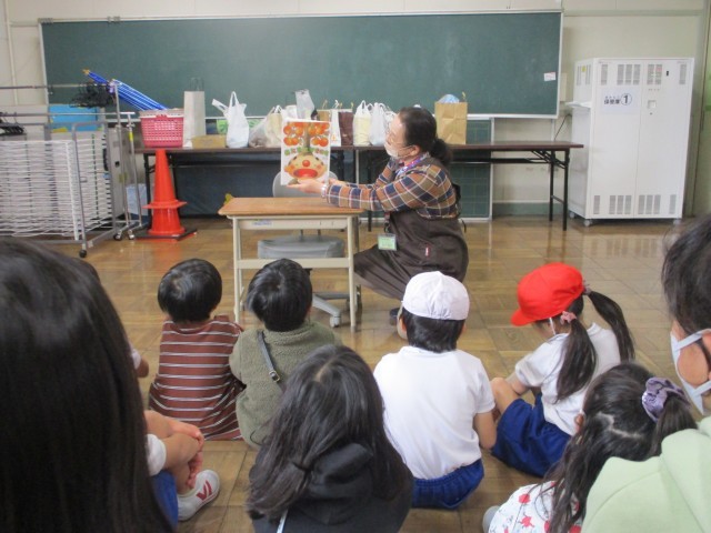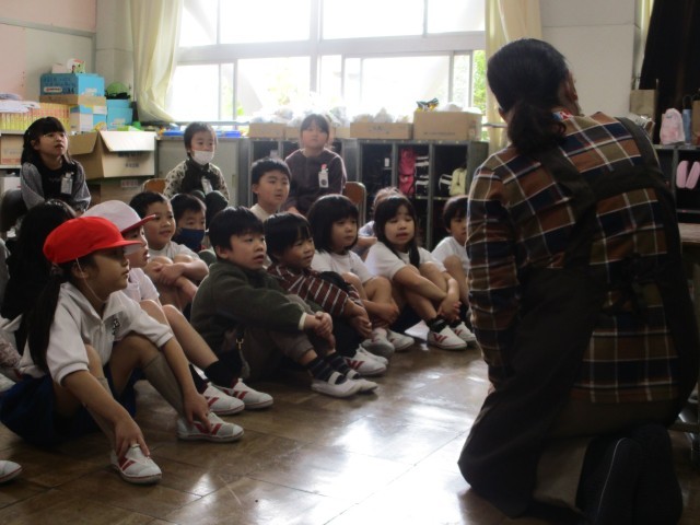 今日は司書さんによる読み聞かせがあり、1.2年生の子どもたちがお話に耳を傾けていました。