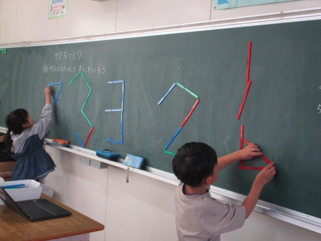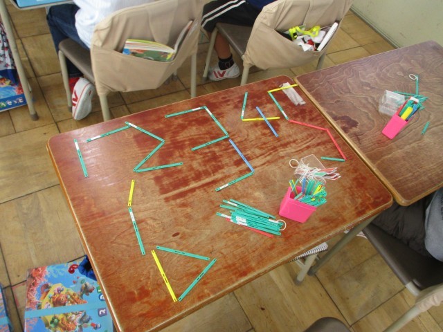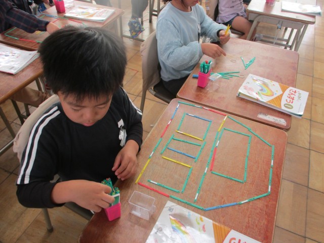 算数の「かたちづくり」の学習では、三角の色板や色棒を使って形を作ったり、点をつないで形を作ったりしています。
