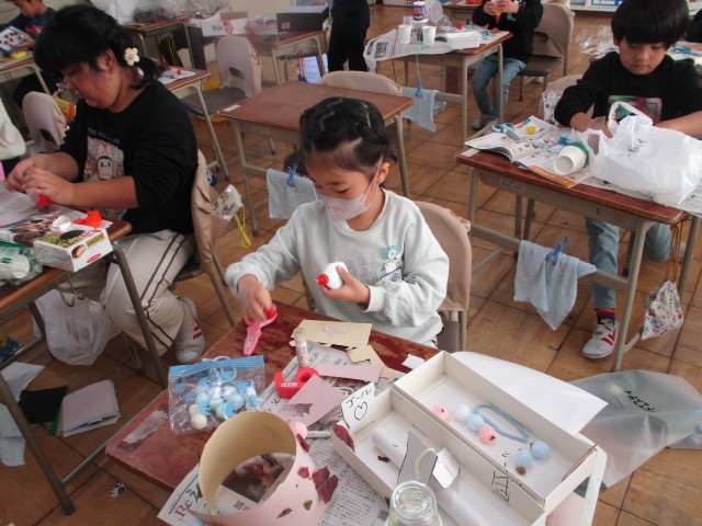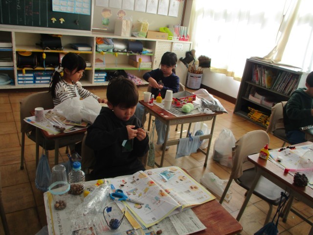 見つけた秋を使ってけん玉やマラカス、メイロやコマなど思い思いに作っています。初めてボンドを使う子も多く、なかなか思うようにはできませんが、根気よく取り組んでいます。出来たらみんなで遊ぼうね。